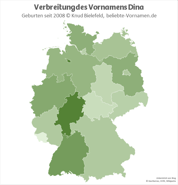 Der Mädchenname Dina wurde in Deutschland seit 2010 mindestens 800 Mal als erster Vorname vergeben. Die ursprüngliche Namensform Dinah wurde nur ungefähr 100 Mal vergeben. Noch seltener kommt die Koseform Dini vor.