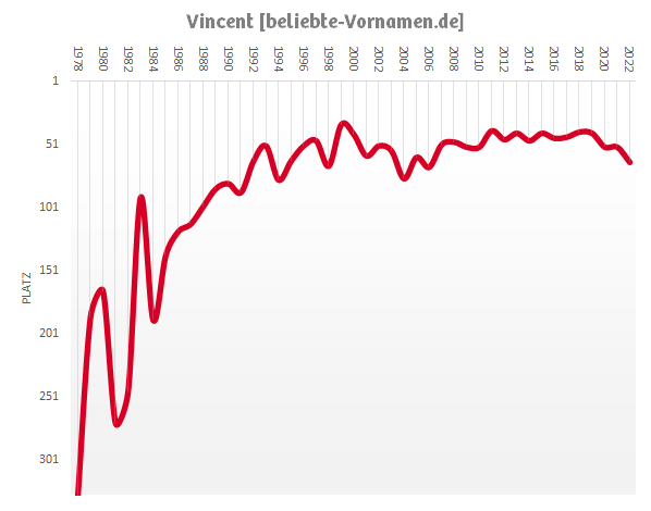 Der Vorname Vincent wird in Deutschland seit den 1990er Jahren zwar regelmäßig vergeben, er gehört aber nicht zu den herausragenden Modenamen. Der Einbruch in der Popularität im Jahr 2020 lässt sich wahrscheinlich darauf zurückführen, dass die deutsche Sängerin Sarah Connor 2019 einen in der Öffentlichkeit und in den Medien viel diskutierten Hit mit dem Titel Vincent hatte. Seit 2010 wurde Vincent mindestens 22.200 Mal als erster Vorname vergeben und die Variante Vinzent mindestens 900 Mal.