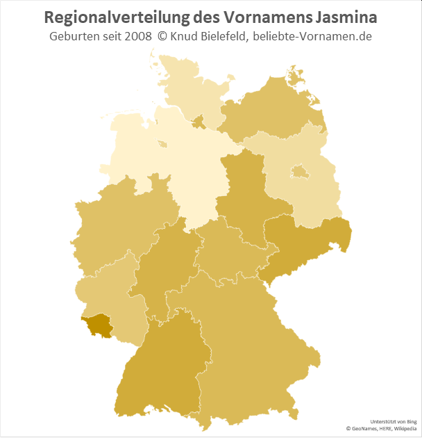 Am beliebtesten war der Name Jasmina in Deutschland Ende der 1980er Jahre. Der Name Jasmina wurde von 2006 bis 2018 ungefähr 1.800 Mal als erster Vorname vergeben. Damit steht Jasmina auf Platz 700 der Vornamenhitliste für diesen Zeitraum. Eine seltenere Schreibweise ist Yasmina.