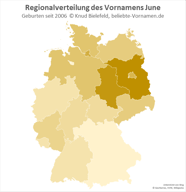 Der Mädchenname June wurde in Deutschland von 2006 bis 2018 ungefähr 560 Mal als erster Vorname vergeben.